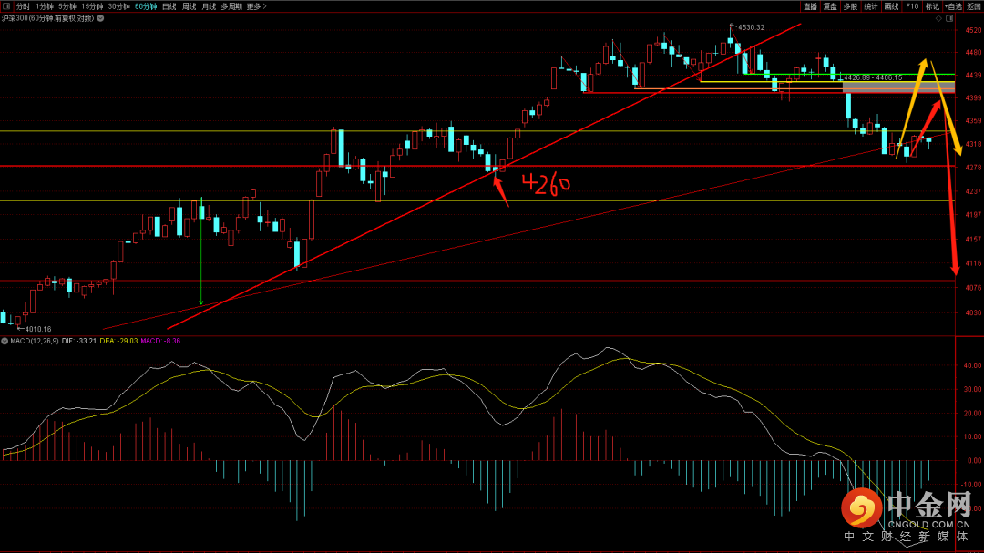 沪深300在三十分钟的上升趋势线附近遇到支撑后出现反弹,短期注意观察4360到4380这个区间压制,如果无法突破大概率会出现三十分钟三卖结构,届时将再次回落,而下方需要关注4295点支撑,如果连续三天跌破这个位置大概率会回落到4060附近。注意把控好关键支撑。