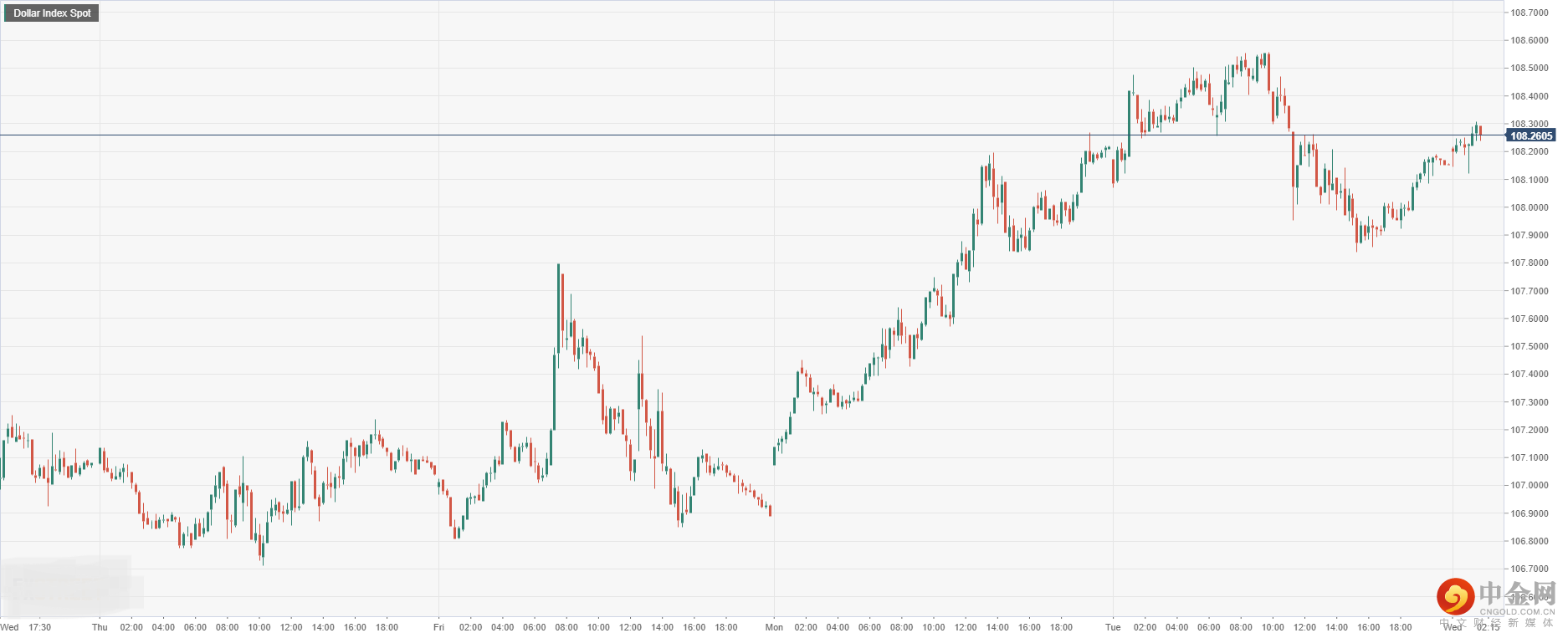 美元指数周二收盘涨跌互现后,今日开盘盘整在108.26附近,因美国经济数据普遍利差,权衡市场对美联储比其他央行有更多加息空间的预期,导致美元小幅下行震荡。