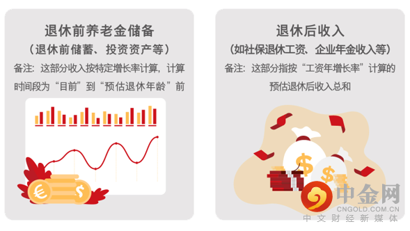 退休预估总收入:即退休前养老金储备(退休前储蓄、投资资产等)按特定增长率计算,计算区间时间段为“目前”到“预估退休年龄”前;退休后收入(如退休工资、企业年金收入等)可以按“工资年增长率”来计算并预估退休后收入总和。