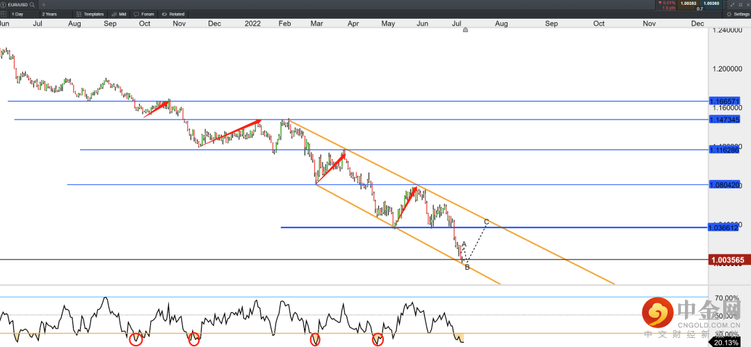欧元兑美元目前处在震荡下行趋势通道中,而1.0的平价位正好是通道下轨处,而上一个平台的支撑为1.0365附近(此处也预估为通道上轨阻力),该点位或将成为新的阻力。