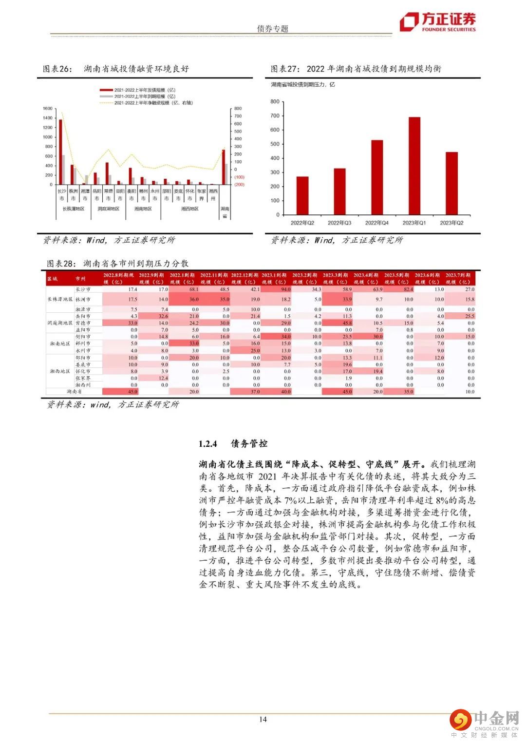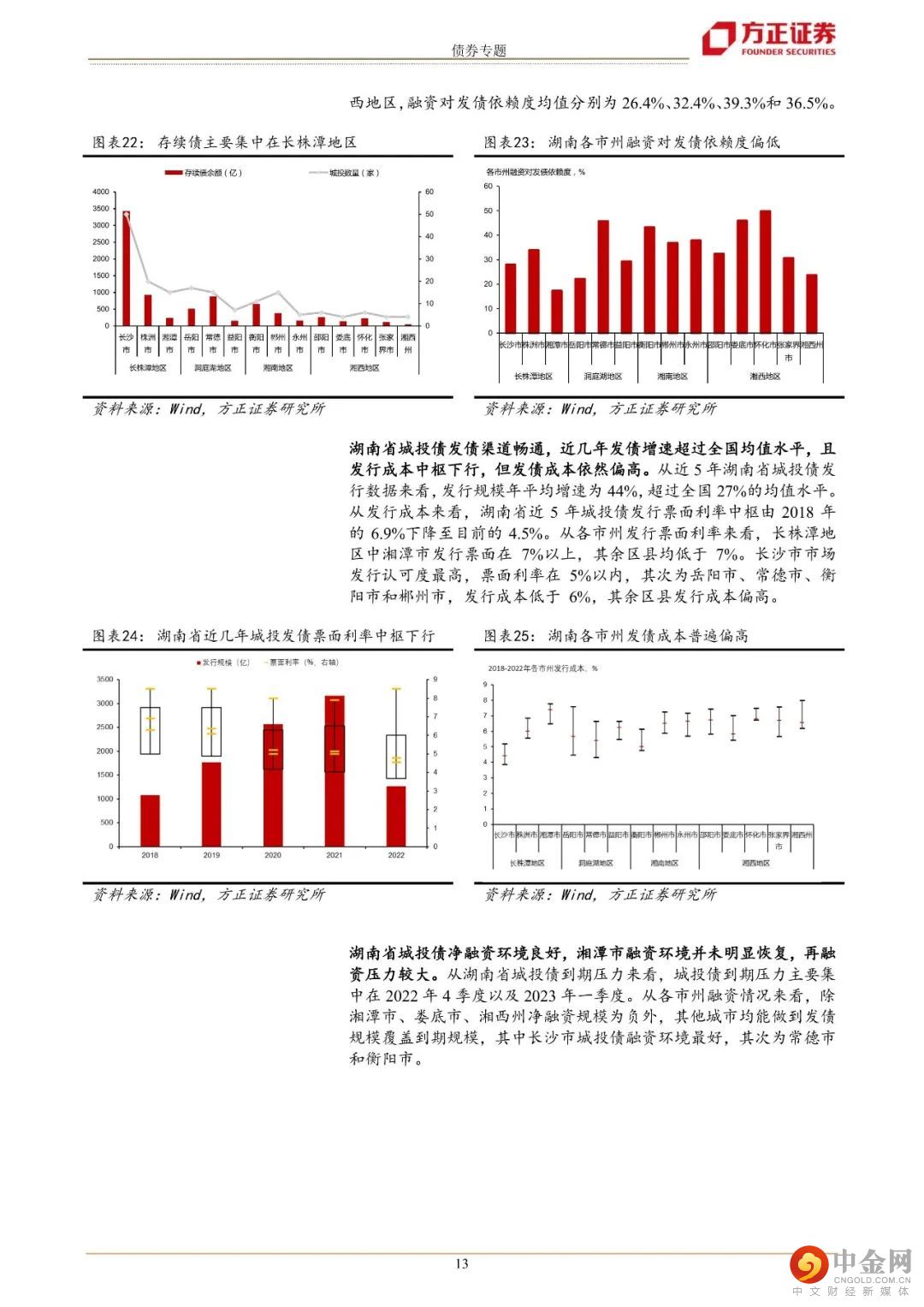 目前湖南省合计179家城投发债主体,存续债券余额8099.9亿元,平台主要集中在长株潭及洞庭湖地区,除常德市、衡阳市、娄底市和怀化市融资对发债依赖度均超过40%外,其余市州融资对发债依赖度不高。湖南省城投发债渠道畅通,近几年发债平均增速为44%,超过全国均值27%的水平,且发行成本中枢下行,由2018年的7%下降至2022年的4.5%。2022年湖南省到期压力主要集中在四季度和2023年年一季度,各区域到期压力相对分散,整体而言,湖南省城投融资环境良好。