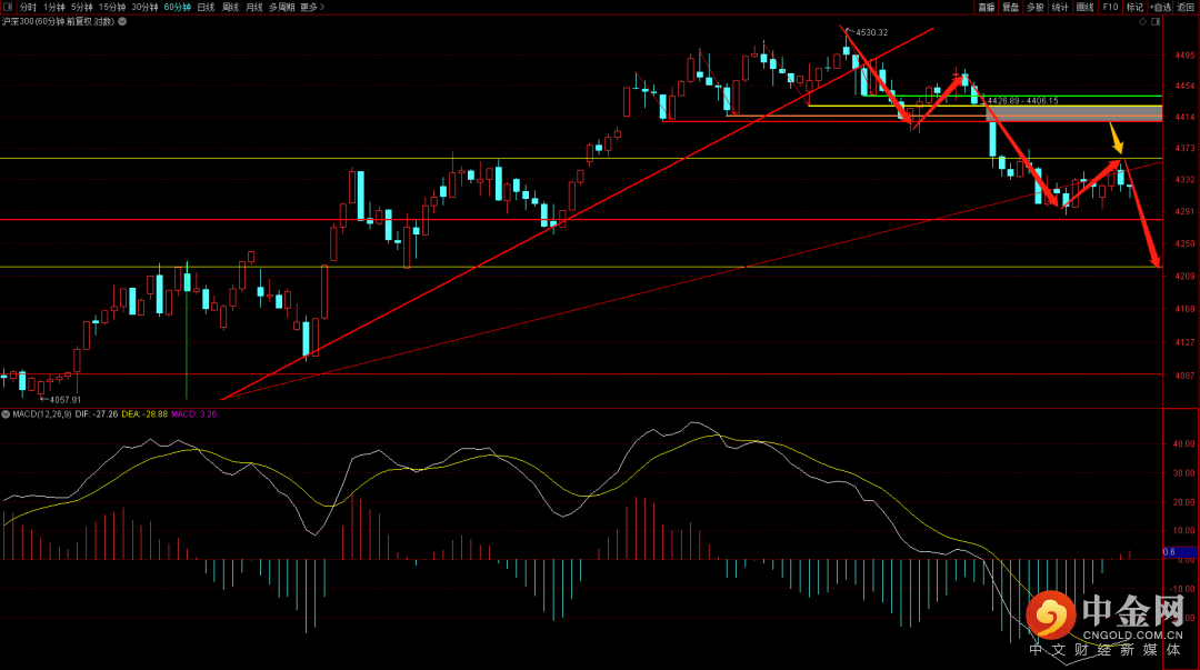 沪深300目前出现三十分钟三卖结构,在没有再次出现扩张突破之前大概率会继续向下调整,关注4260附近的支撑,在没有跌破之前上升趋势就还没有被破坏。而上方强压制大概率还在4373到4400这个区间。