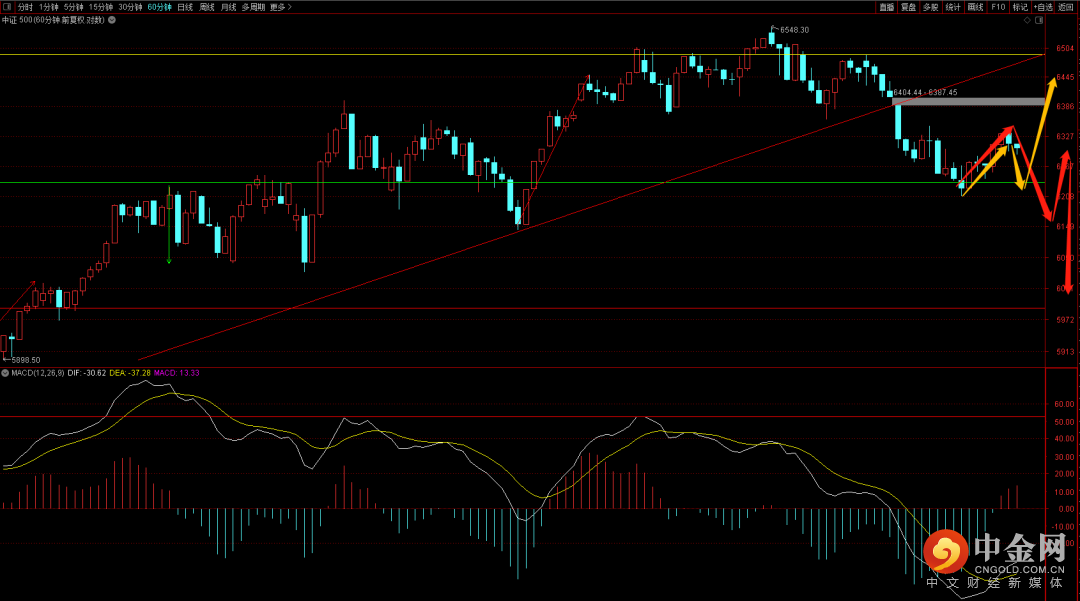 中证500短期需要关注6340点压制,如果没有突破则大概率还会再次下跌,从周期看这个位置大概率还会有一周的调整,耐心等待调整周期结束。