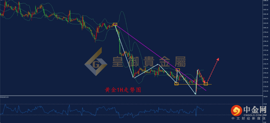 从黄金1小时周期来看,金价在下破1723的长期盘整平台下轨后,迅速拉回盘整区间上轨附近,从形态上看,呈现破底翻的反转形态,且价格上破下降趋势线的压制,表明金价上涨的概率增大,下方1723附近可以作为较好的多单入场点,上方关注1752盘整区间上轨压力。从RSI指标来看,RSI指标短暂下破30.0后迅速拉回,并维持在50.0上方运行,表明多头动能偏强,因此日内建议投资者尝试在1723支撑附近布局多单。