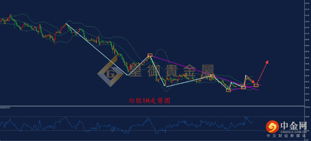 从下方白银1小时周期图看,虽然白银整体仍处于震荡盘整形态,但自18.73低点反弹以来,呈现高低点逐步上移的看涨形态,价格在上破下降趋势线的压制后,并形成新的支撑线,今日18.95的支撑线支撑可作为较好的多单入场点,上方关注19.45的前高压力,上破后有望进一步看涨至20.00整数压力附近。从RSI指标来看,RSI指标自30.0附近企稳以来,呈现高低点逐步上移的看涨形态,表明多头动能偏强,日内存在向上测试70.0的机会,建议投资回落接多,可以尝试在18.95的支撑线附近布局多单。