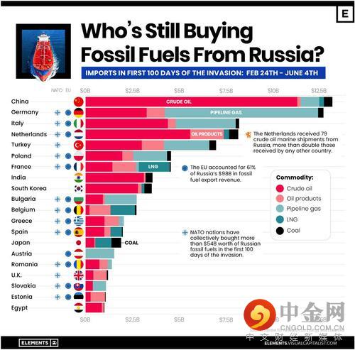 除中东外,Visual Capitalist还展示了俄乌冲突爆发至6月4日的100天内,购买俄罗斯原油、石油产品、管道天然气、液化天然气和煤炭的主要国家。其中,中国是进口俄罗斯石油最多的国家。