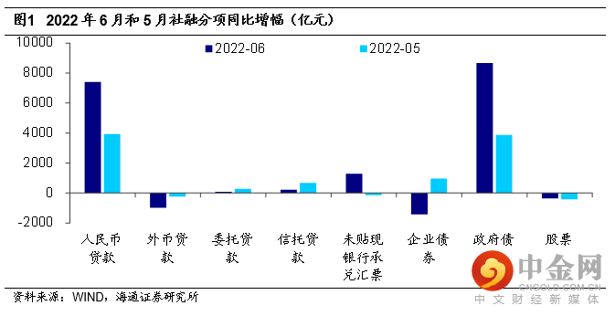 6月社融大幅多增。6月新增社融5.17万亿元,高于Wind一致预期的4.64万亿,社融增速也进一步上行至10.8%,创2021年7月以来的新高,反映了疫情影响缓解后融资需求的改善。从同比变化看,6月社融同比多增1.47万亿元,其中主要贡献项仍是人民币贷款和政府债券,分别同比多增7400亿元和8687亿元。