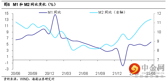 M1同比回暖,M2继续上行。6月M1同比录得5.8%,较5月同比上行1.2个百分点,一定程度反映了6月房企资金面受益于地产销售的回暖。M2方面,在信贷派生改善、财政继续发力、留抵退税政策的共同作用下,M2同比继续回升0.3个百分点至11.4%。
