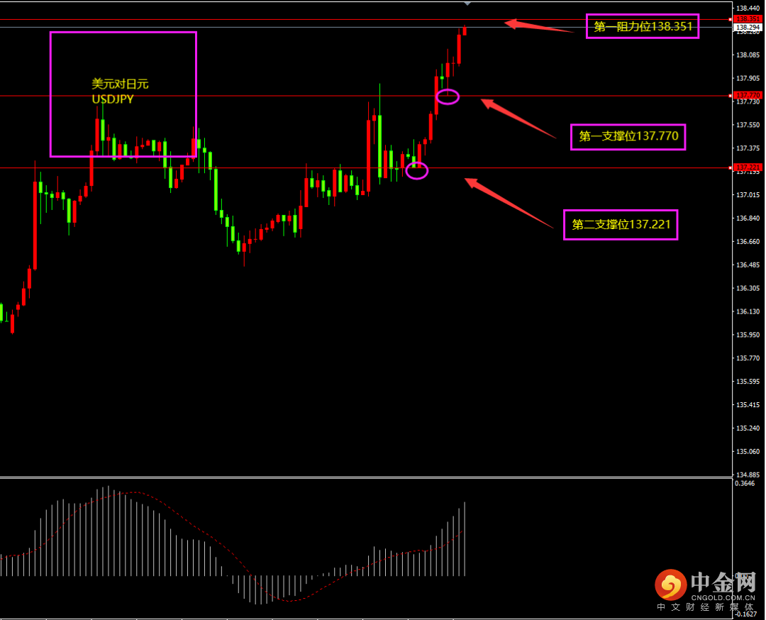 天图美日收阳线,价格有所冲高,多头有所增强,短期上影线较长,看似孕育空头,实则MACD能量未减,多头增势,日内更多以震荡以及震荡上行为主。小时图美日期间连续阳线拉升,MACD位于0轴之上,多头占优,短期上方无大阴线回落,空头较弱,日内更多以逢低看多为主。