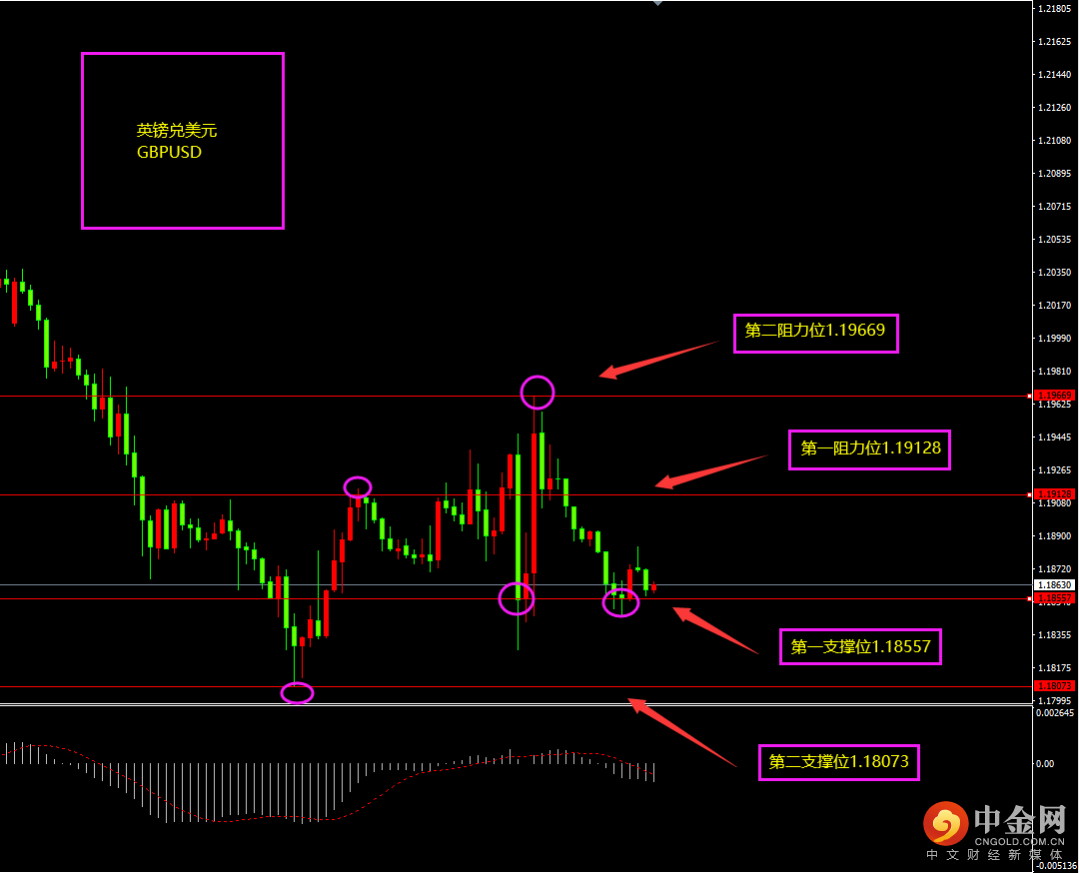 天图欧元收小阳线,价格小幅冲高,但上影线较长,上行多头遭受空头反扑,短期MACD位于0轴之下,空头仍在,日内更多以震荡以及震荡下行为主。小时图欧元期间有大阳线筑底,看似多头力度有所增强,但上方有连续阴线回落,空头仍然强势,日内更多以逢高看空为主。(大阳线不出,多单不入)