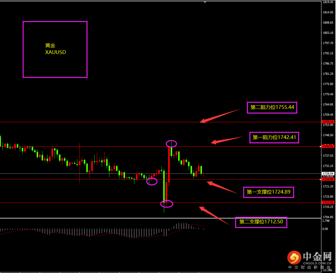 天图黄金收阳线,价格有所冲高,多头有所增强,短期下影线较长,下行空头遭受多头反扑,随着底部多头的增强,日内更多以逢低看多为主。小时图黄金底部有大阳线筑底,MACD转移至0轴附近,价格多空低位博弈,短期上方有连续阴线回落,空头仍在,日内更多试探性以逢低看多为主。(大阳线不出,多单不入)