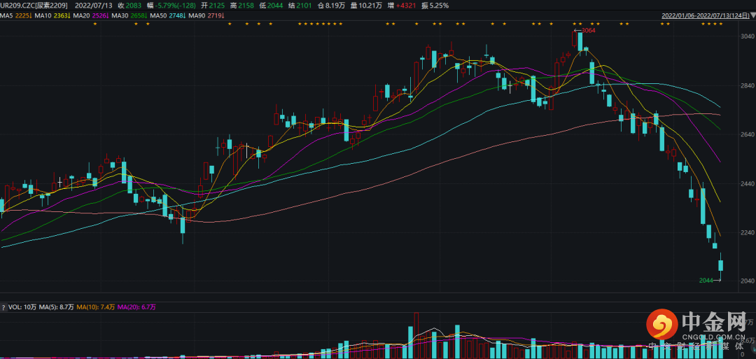 从6月8日的最高点3064元/吨跌至昨日盘中最低2044元/吨,尿素期货主力合约价格