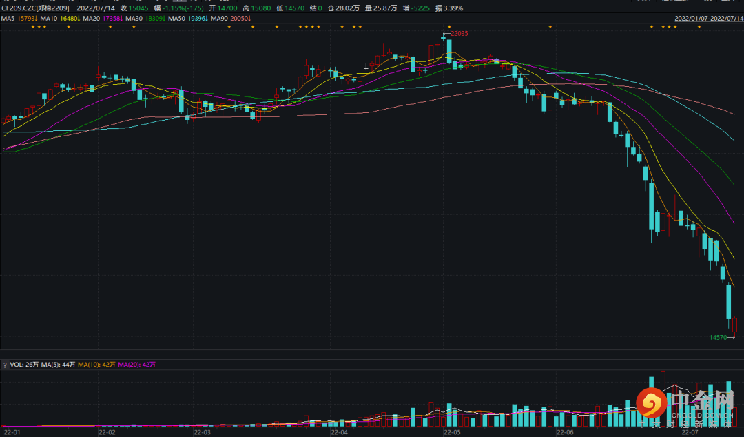 5月初以来,棉花价格跌跌不休,近期跌势加速。周三,国内棉花期货主力2209合约更是最低下探14790元/吨,创一年多以来新低。截至收盘,棉花期货主力2209合约跌幅近7%,棉纱期货主力2209合约跌幅4.87%。