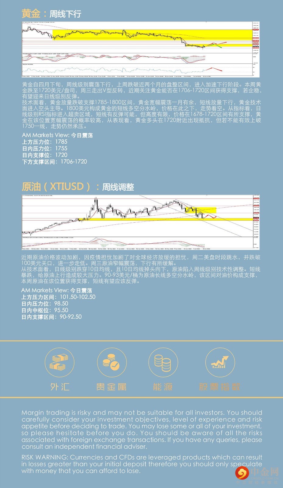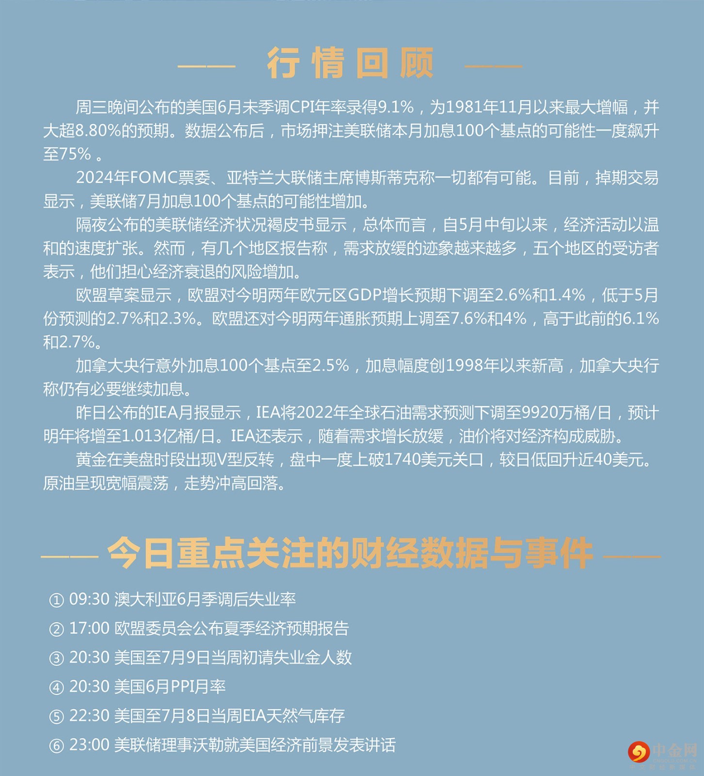 周三晚间公布的美国6月未季调CPI年率录得9.1%,为1981年11月以来最大增幅,并大超8.80%的预期。数据公布后,市场押注美联储本月加息100个基点的可能性一度飙升至75% 。 2024年FOMC票委、亚特兰大联储主席博斯蒂克称一切都有可能。目前,掉期交易显示,美联储7月加息100个基点的可能性增加。 隔夜公布的美联储经济状况褐皮书显示,总体而言,自5月中旬以来,经济活动以温和的速度扩张。然而,有几个地区报告称,需求放缓的迹象越来越多,五个地区的受访者表示,他们担心经济衰退的风险增加。 欧盟草案显示,欧盟对今明两年欧元区GDP增长预期下调至2.6%和1.4%,低于5月份预测的2.7%和2.3%。欧盟还对今明两年通胀预期上调至7.6%和4%,高于此前的6.1%和2.7%。 加拿大央行意外加息100个基点至2.5%,加息幅度创1998年以来新高,加拿大央行称仍有必要继续加息。 昨日公布的IEA月报显示,IEA将2022年全球石油需求预测下调至9920万桶/日,预计明年将增至1.013亿桶/日。IEA还表示,随着需求增长放缓,油价将对经济构成威胁。 黄金在美盘时段出现V型反转,盘中一度