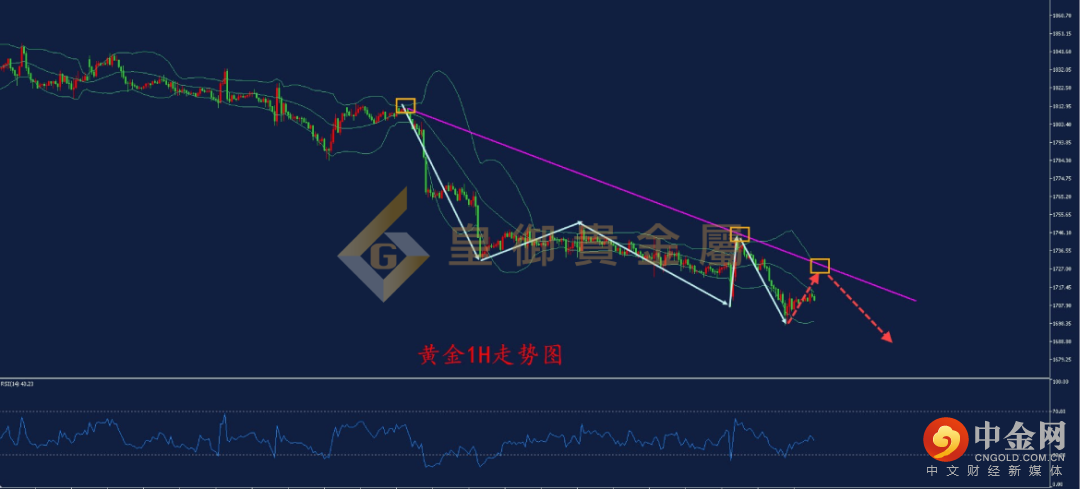从黄金1小时周期来看,金价呈现高低点逐步下移的看空形态,上方1725是下降趋势线与布林带上轨共同的压力位,该位置可以做较好的空单入场点,下方关注1700的整数支撑,一旦再次下破,进一步看向1680的前低附近支撑的概率增大。从RSI指标来看,RSI指标自30.0附近展开反弹,但受制于50.0的压制,表明空头动能偏强,因此日内建议投资者尝试在1725的趋势线压力附近布局空单。