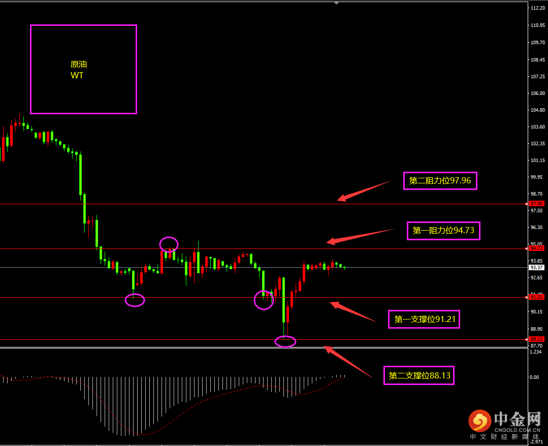 第一、二阻力位附近轻仓看空,如有大阳线突破第二阻力位则转为观望。