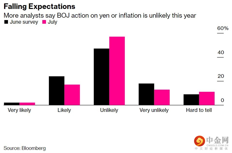 事实上,市场认为政府干预汇市以阻止日元贬值的可能性有所上升。约17%的受访者表示,政府有可能或非常有可能对市场采取直接行动,高于6月份的7%。