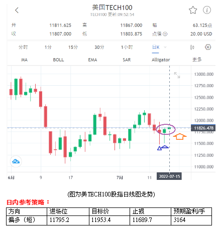 昨日美股三大指数涨跌互见,道琼和标普小跌、纳指微涨,投资人正消化两家大型银行股的财报和美联储理事沃勒的最新谈话。其中,摩根大通业绩反映消费支出、企业借贷稳健,且高层认为美国经济短期内不致衰退,但不确定性犹存。另外,昨日苹果涨2.05%、特斯拉涨0.54%、微软涨0.54%,英特尔涨1.34%,显示大型科技股有助支撑纳指收涨,对比投资人对于美联储7月升息100个基点的机会上升88%,不仅有助淡化冲击,更凸显利空不跌的上行机会。