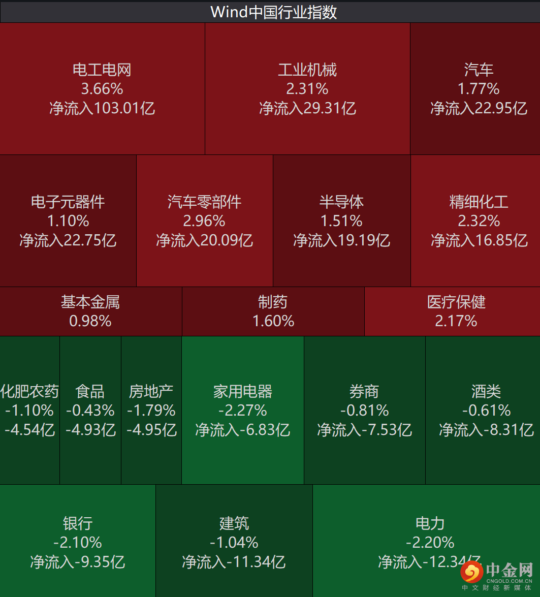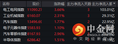 据wind主题行业看,电工电网指数、工业机械指数、汽车指数、电子元器件指数等主力净流入额排名居前。