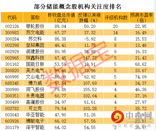 值得关注的是A股市场上储能概念股有240多只,总市值超过7万亿元。3家以上机构关注的储能概念股中,有17只个股总市值在100亿元以下。