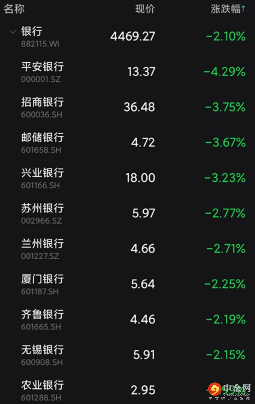 截至收盘,银行板块收跌1.54%,居于全行业板块尾部。其中,招商银行收跌3.75%、邮储银行收跌3.67%、兴业银行收跌3.23%。