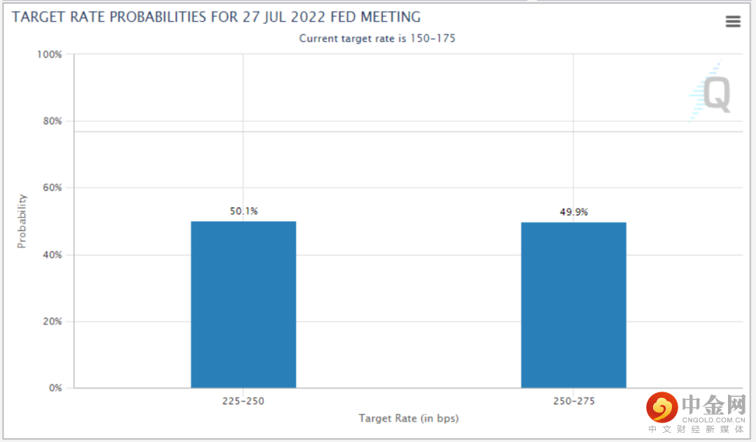 比预期火热的通胀报告的第一阶段效应,从逻辑上来说是推高美联储短期加息的预期。在进入本周时,交易者仅计入2%的几率FOMC在月末加息100个基点。但此文发稿时,硬币翻转到另一面,这个数字超过了50%。请看下图CME FedWatch有关联邦基金期货市场的预期:
