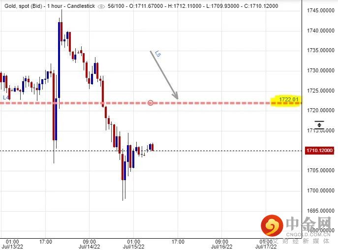 可以部署在$1,722美元左右建立淡仓盘,短线看淡金价一线至$1,688美元水平后止赚,止损在$1,730美元。