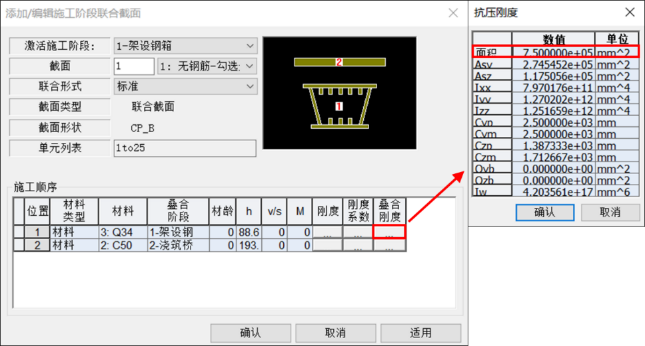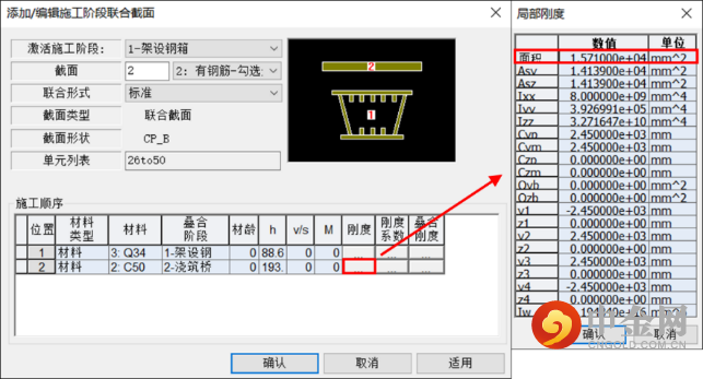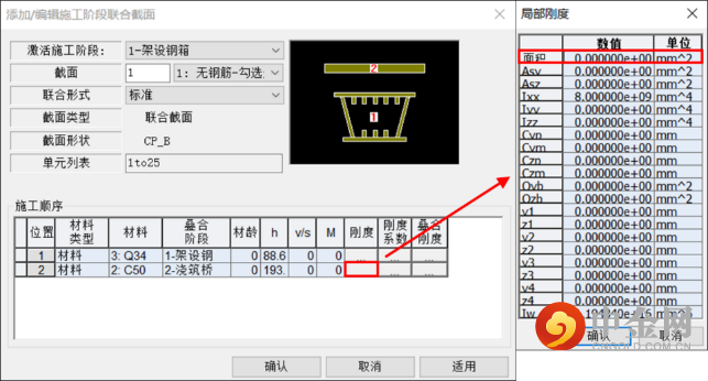 此时查看施工阶段联合截面Part2的刚度,数值为0,即不考虑开裂桥面板的刚度: