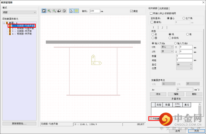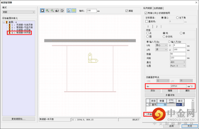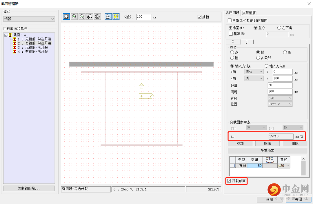 当模型中定义了施工阶段联合截面后,刚度将不在这里调取,需要在施工阶段联合截面中查询;接下来测试该问题,测试思路:先考虑截面开裂,查看普通钢筋对开裂后截面刚度的影响,再来测试正常截面下的影响。