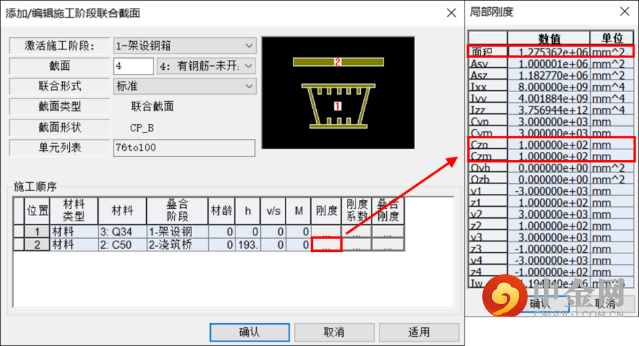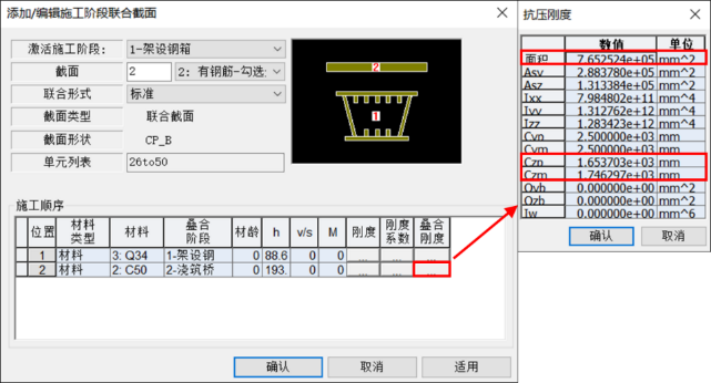 截面特性值可以查看值前(Part1)和值后(组合)的刚度数值,而当截面中定义了普通钢筋后,虽然会考虑普通钢筋对应力结果的影响,但是却查不到普通钢筋对截面刚度的影响,而只有定义了施工阶段联合截面才能查到考虑普通钢筋后的截面刚度。