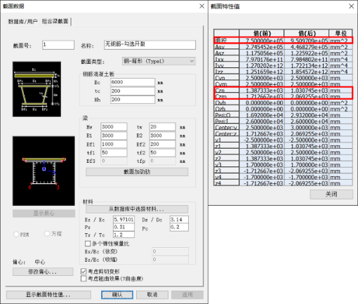 组合前Part1的Czp=1387.333mm,Czm=1712.667mm,Czp+Czm=3100mm,即钢箱的高度;而组合后的Czp=1653.703mm,Czm=1746.297mm,Czp+Czm=3100mm,也是钢箱的高度;换言之,普通钢筋并没有影响截面高度,勾选开裂后Czp+Czm为钢箱高度,而不是组合梁高度。
