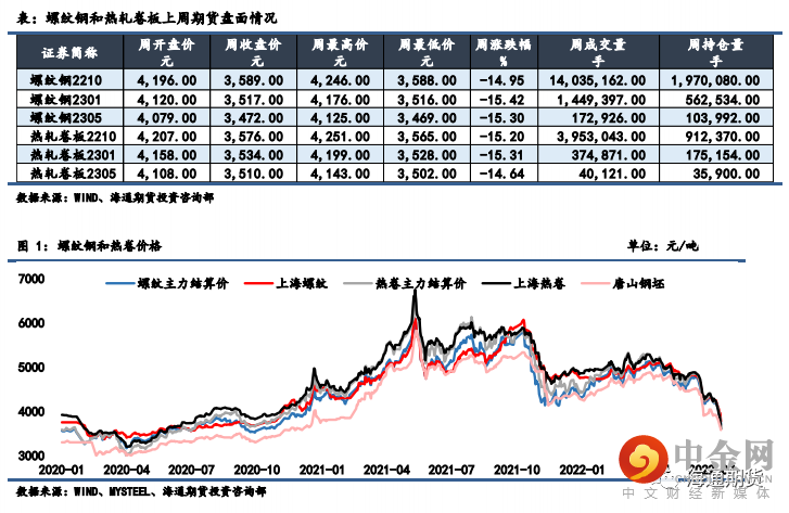 上周钢材期货盘面价格大幅走弱,现货价格大幅下行。上周螺纹钢 2210 合约下跌 14.95%至 3589