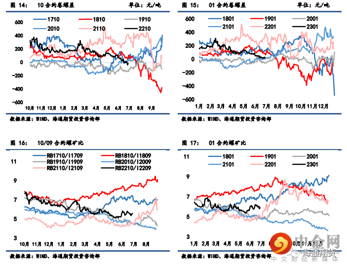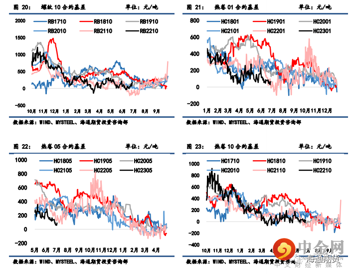 螺纹 10-01 月间价差从 61 微增至 72 元/吨;热卷 10-01 月间价差从 48 微降至 42 元/吨。上周热