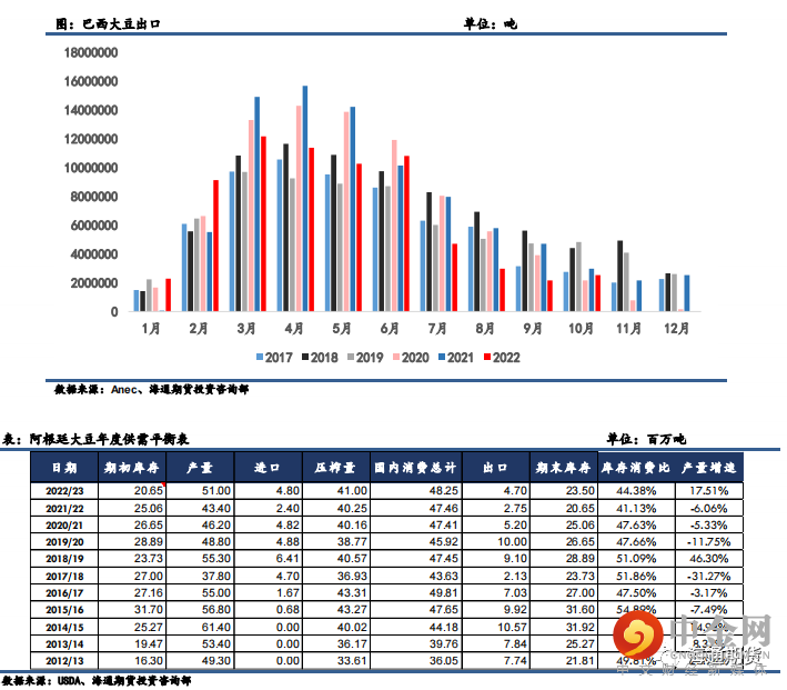 大豆的出口,巴西和阿根廷大豆 22/23 年度出口共计 9320 万吨,同比增加 820 万吨,