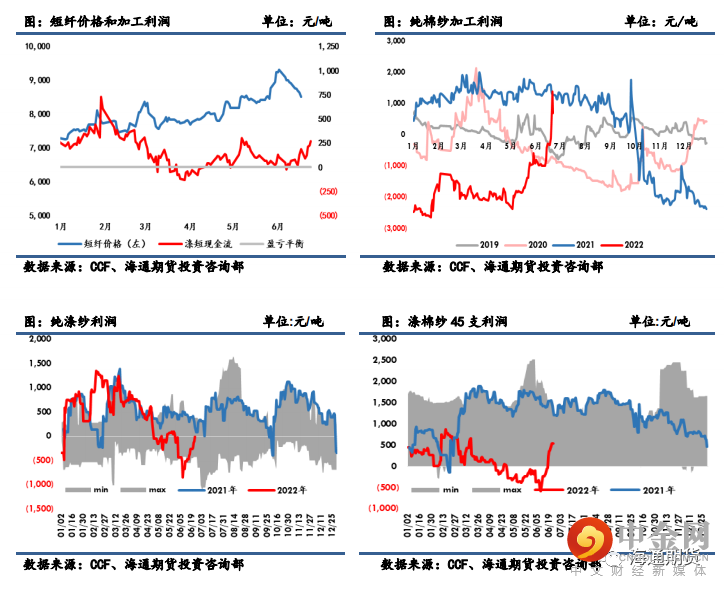 随着近两周短纤价格的大幅下跌,纯涤纱和涤棉纱的利润已经回升至正常水平。