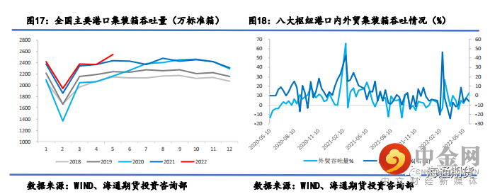 出口方面,截止到5月份全国主要港口集装箱吞吐量当月值同比增长4.3%,八大枢纽港