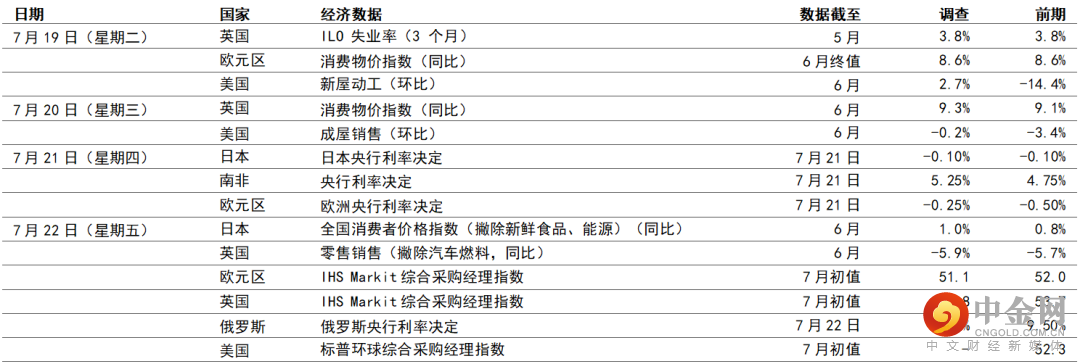 日本央行可能维持所有政策不变,但可能上调22财年和23财年的通胀预测,并下调该两个年度的增长预测。日本全国核心消费物价指数通胀(不包括新鲜食品)可能由5月份的2.1%(同比),进一步加快至6月份的2.2%(同比),由于政府推出政策措施,这可能受食品价格(不包括新鲜食品类别)上涨和其他核心分项数据(不包括特殊因素,如能源、电话和酒店费用)推动。对日元贬值敏感的类别可能面对物价压力,但通胀应大致可保持在可控范围。核心通胀(不包括新鲜食品和能源)可能由上月的0.8%(同比),微升至1.0%(同比)。