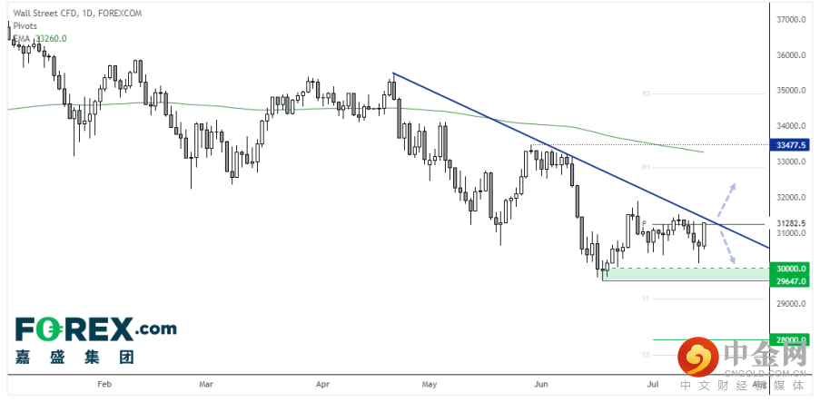 道指正在试图走出逆势反弹行情。上周四形成了一根看涨锤子K线,也构筑了上抬的低点。上周五延续了上涨动能。如果可以站上下跌趋势线,后市或上看月图第一支撑中枢。如果受制于趋势线并走出一根阴线,我们继续看跌。