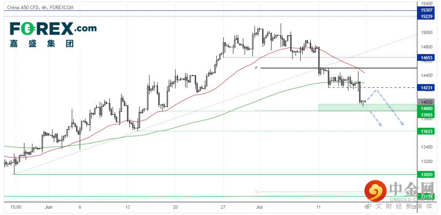 中国A50指数4小时图同样处于下跌趋势中,但在14,000一线支撑企稳,或已构筑周期低点。受制于月图中枢点位继续看跌,但我们也会在反击14,230时考虑逢高沽出。下破13,900,则下跌趋势延续可期。