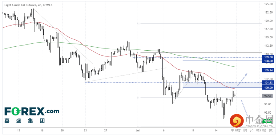 西得州原油4小时图仍处于下跌趋势中,现在交投于100下方,该位可能在近期构成阻力中枢。价格沿着50期指数移动均线构筑系列下降的高点。如果形成一根看跌吞噬K线或系列看跌锤子形态,可视为新的下降高点就位的信号,维持下跌趋势。站上101.53则扭转下跌趋势。