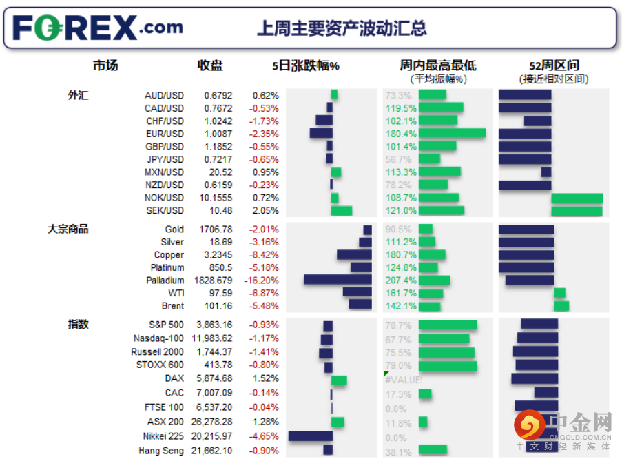 上周五主要货币中美元最弱。有消费者报告显示,通胀预期下跌,其继而降低美联储下次会议加息100个基点的几率。
