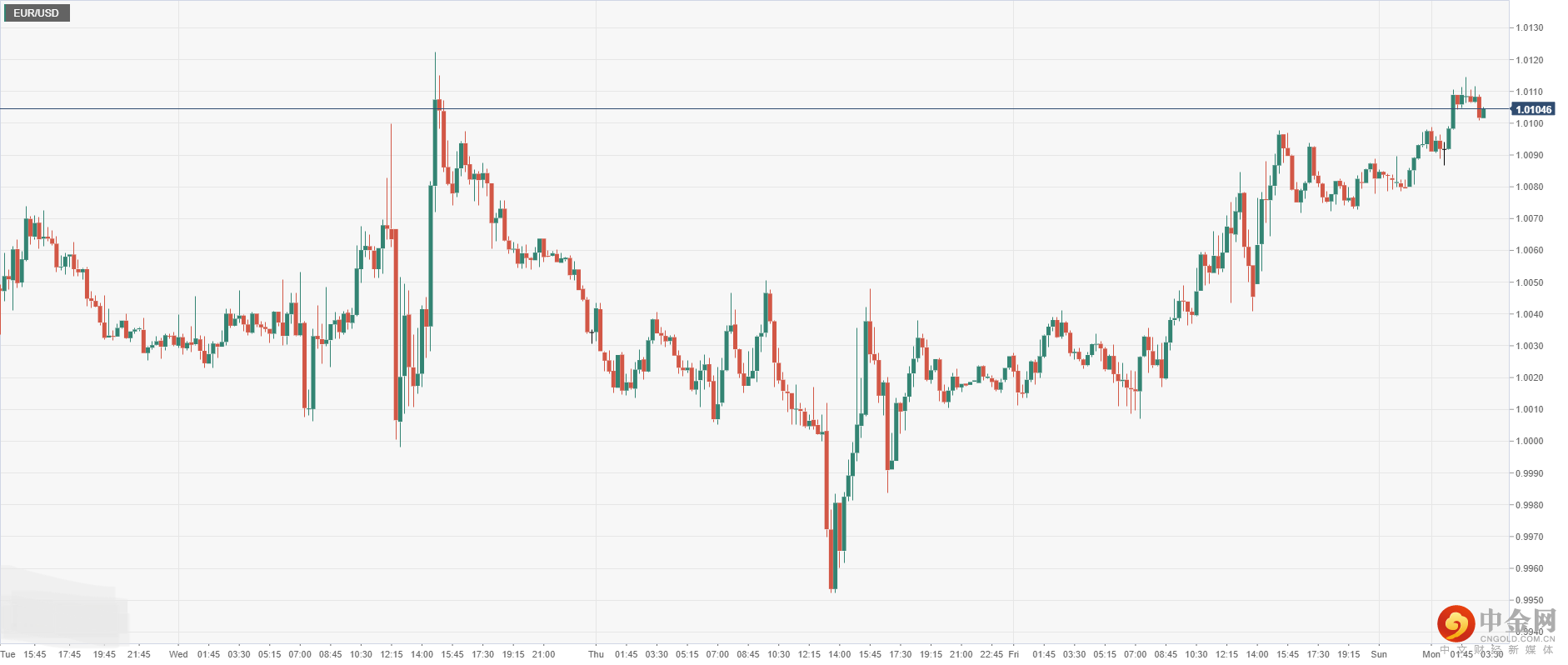 欧元兑美元上周五收盘大幅上涨后,今日开盘升至1.0104,因美元短线疲软震荡,使得欧元上行支撑。
