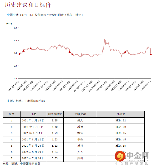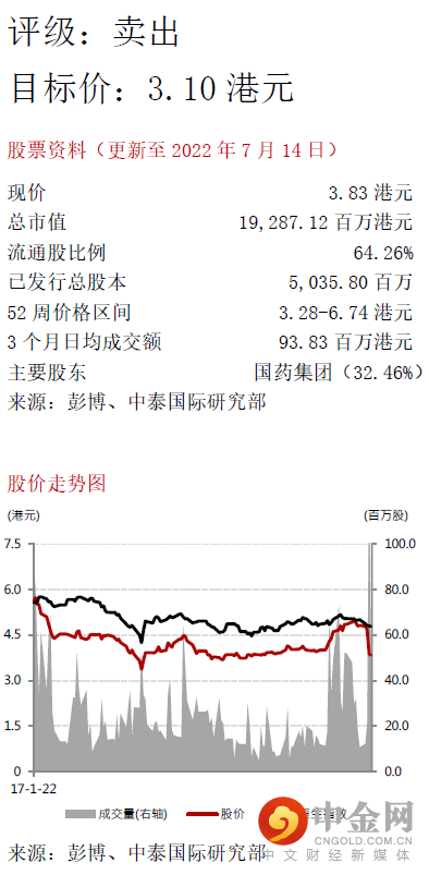 综合以上因素,我们下调公司中药配方颗粒的收入预测,并将2022-24E股东净利润预测分别下调50.3%、37.4%、36.9%。我们按照8.0倍2023E PER定价,将目标价从5.05港元调整至3.10港元,给予“卖出”评级。我们认为短期内影响公司业绩的主要是中药配方颗粒质量标准的审批进度,今后将主要关注这方面进展。