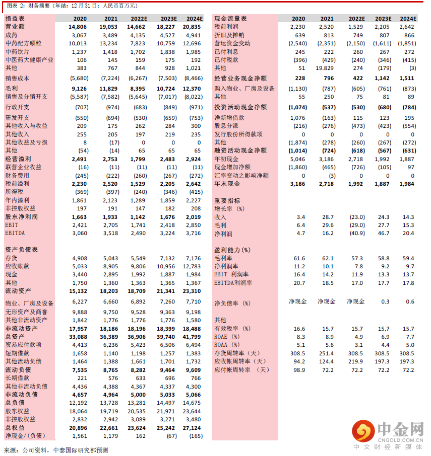 公司日前表示,主营业务中药配方颗粒销售今年上半年表现欠佳(占2021年收入约70%),预计股东净利润将同比下滑约50%~60%。除新冠疫情对部分医疗机构营运造成影响外,国内中药配方颗粒的质量控制标准的制定速度慢于预期,导致公司部分原来按照企业标准生产的产品暂时无法继续在医院销售,中药配方颗粒销售收入将低于去年同期。