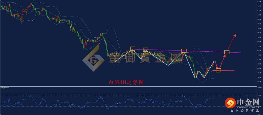 从下方白银1小时周期图看,白银自18.13低点反弹以来,呈现高低点逐步上移的看多形态,且价格维持在布林带中轨上方运行,布林三轨拐头向上,表明行情处于偏多走势,下方18.60的布林中轨支撑可以作为较好的多单入场点,企稳后有望向上测试19.30的压力线压制位。从RSI指标来看,RSI指标自30.0下方上涨以来,呈现高低点逐步上移的多头形态,表明多头动能偏强,建议投资回落接多为主,可以尝试在18.60的压力附近布局多单。