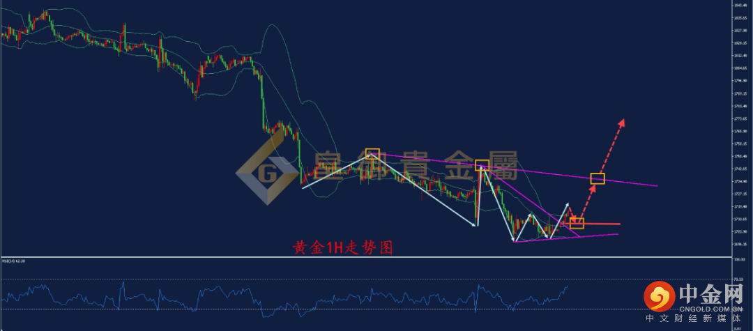 从黄金1小时周期来看,金价自1697低点反弹以来,呈现高低点抬高的走势,且价格上破短期压力线的压制,早间金价维持在布林带中轨上方运行,表明行情处于偏多走势,下方关注1709的布林中轨支撑,企稳后有望看向1730的趋势线压制位,上破后进一步看涨之1752前高压力的概率增大。从RSI指标来看,RSI指标自30.0下方上涨以来,呈现高低点逐步上移的多头形态,表明多头动能偏强,因此日内建议投资者尝试在1709的布林中轨支撑附近布局多单。