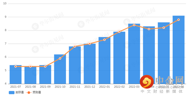 2022年美联储开启新加息周期后,加息路径很快就变得剧烈陡峭,令市场在震惊之余,也对美联储如此行动的背后逻辑十分关注。从直观来看,美联储此轮加息周期的主要痛点,在于美国近期如脱缰野马般奔腾的通货膨胀率。美国的通胀率于2021年下半年开始出现突破性涨势,7月份CPI“破4进5”,被市场和专家们预期了约1年的美国史诗级大通胀终现端倪,此后经历8月、9月短短两个月份的“假静默期”后,于2021年10月开始一飞冲天,接连突破6、7、8关口,直到2022年6月,终于击破9关口(如图2-1所示)。