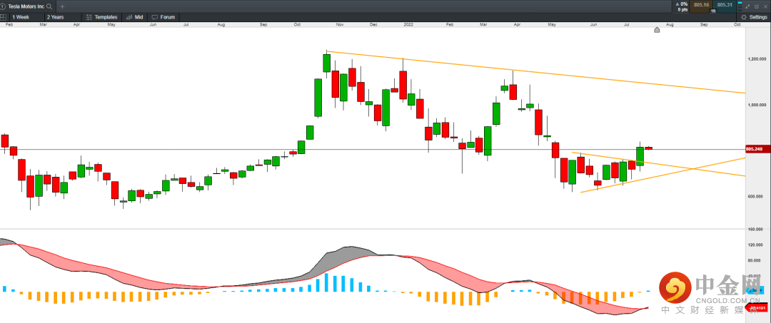 从周线级别来看,特斯拉自5月底以来在底部形成三角收敛区间,上周实现了技术性的向上破位,因此价格或向上进一步延续,MACD在0轴下方形成金叉背离。