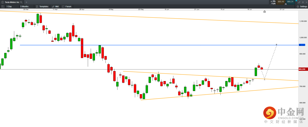 上周四特斯拉股价放量突破三角盘整区间,其成交量大于前期均量,在随后的两个交易日出现缩量回调,卖盘相对较小。因此,股价整体或仍有上行空间。近期可关注回补缺口处和三角区间上轨的支撑750附近。股价若回调至该区域或继续上行。上方目标为图中蓝线处:950。