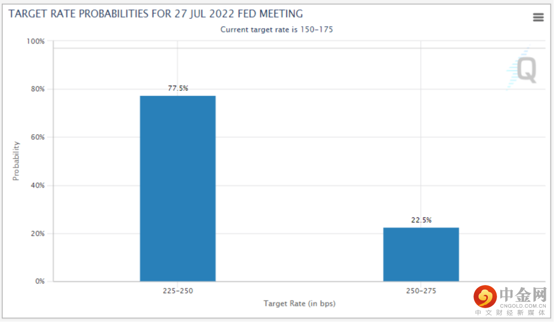 从CME的FedWatch工具判断,交易者目前计入加息75个基点的几率为四分之三左右,加息100个基点的几率为23%左右。